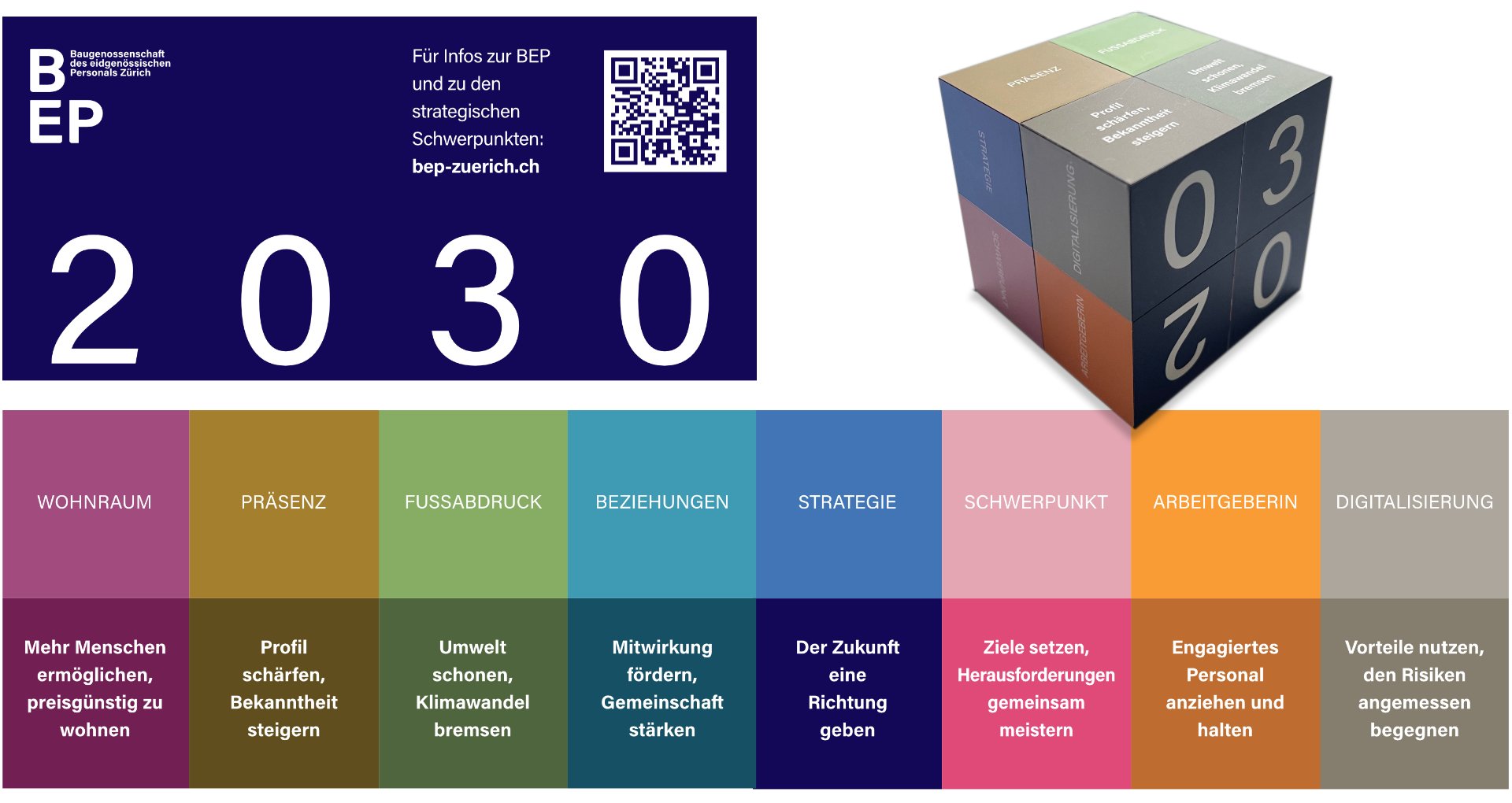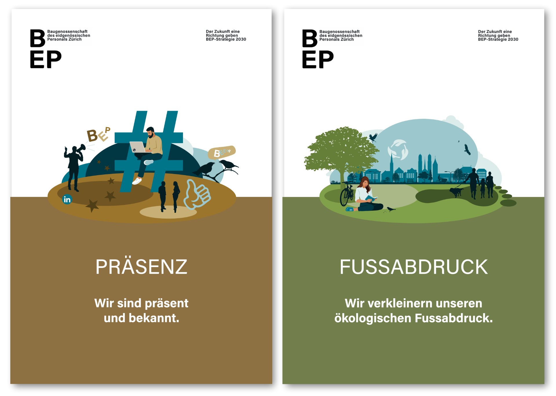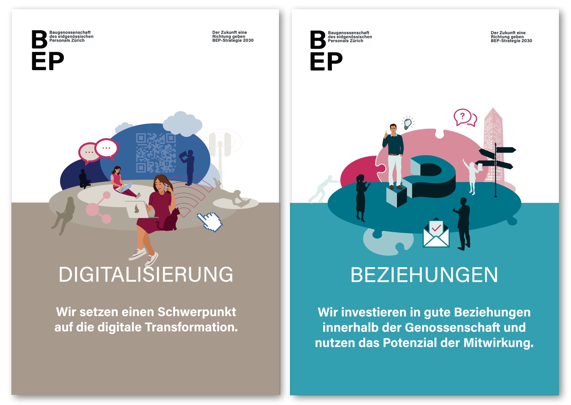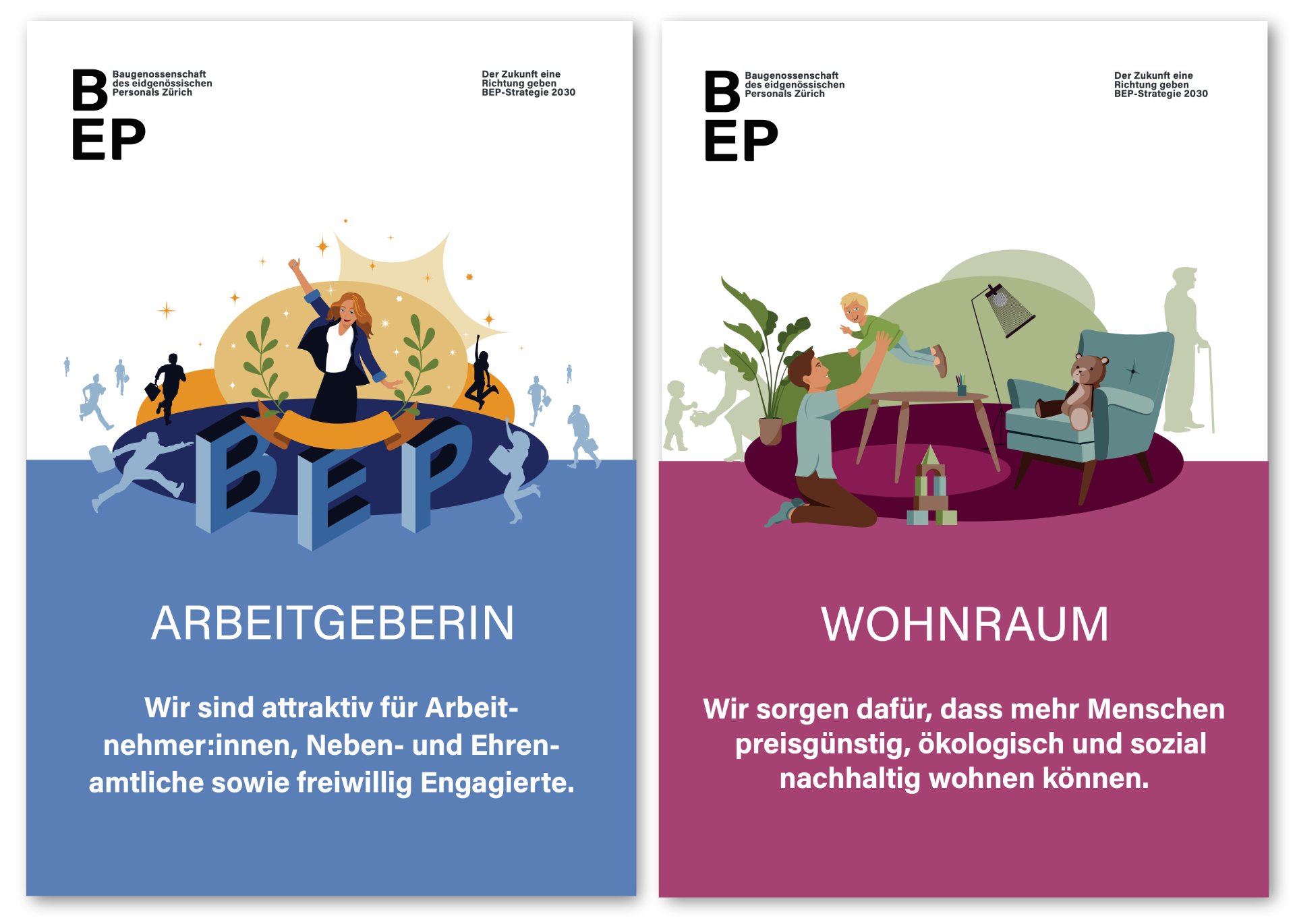 Für die Kommunikationsabteilung der Baugenossenschaft des eidgenössischen Personals Zürich entstanden vielschichtig illustrierte Kompositionen, welche die Fokusthemen der Strategie 2030 visualisieren. Die sogenannten Key Visuals (Schlüsselbilder) dienen als Metaphern und helfen der Orientierung und Zieldefinierung. Sie finden Anwendung auf verschiedenen Kommunikationsmitteln und Produkten.